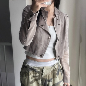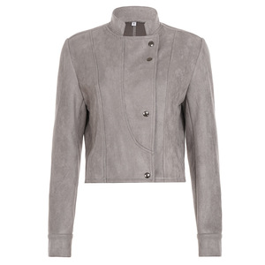 欧美秋冬新款甜酷帅气灰色麂皮机车服外套女辣妹修身短款立领夹克