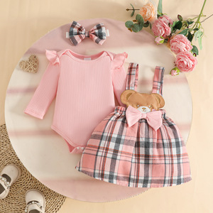 婴儿秋冬卡通熊背带裙套装女婴坑条长袖上衣格子格子裙发带三件套