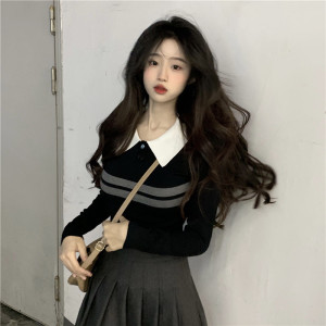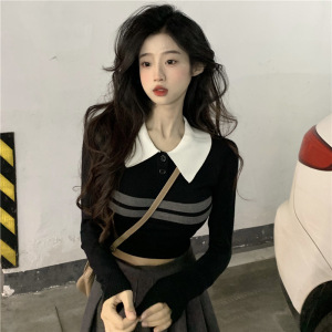 早秋假两件叠穿上衣撞色polo领针织打底衫秋修身高腰短款长袖毛衣
