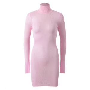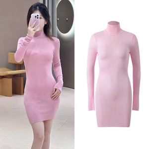 2025秋冬新款粉色高领气质时尚通勤修身显瘦包臀长袖针织连衣裙