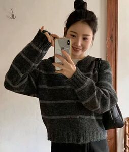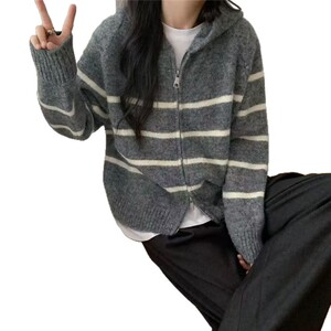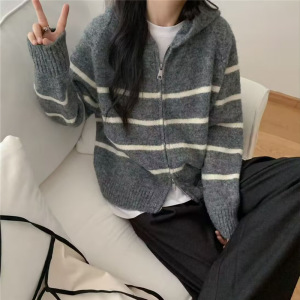 复古慵懒宽松条纹毛衣外套女韩版秋冬新款连帽拉链针织开衫女潮
