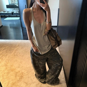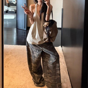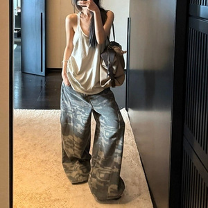 YOLO SHOP1美式复古迷彩色水洗做旧牛仔长裤女秋季宽松阔腿工装裤