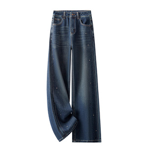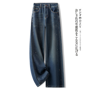高腰阔腿牛仔裤女秋季新款高级感镶钻直筒裤垂坠感宽松拖地裤