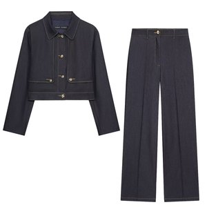 跨境欧美女装速卖通爆款早秋时尚休闲撞色缉线短外套+直筒棱线裤