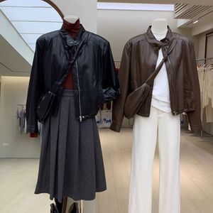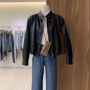 立领皮衣外套女2025秋两色休闲下摆抽绳收腰显瘦宽松短款夹克外套