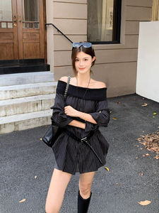 2025秋季新款一字肩长袖针织系扣条纹衬衫配腰带气质裤裙套装
