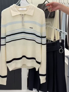 5天/韩版东大门同款pou*h条纹拼色设计半拉链翻领套头毛衣针织衫