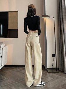 卡其色牛仔裤女春秋季新款宽松显瘦小个子窄版阔直筒牛仔裤女长裤