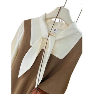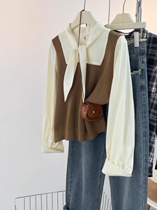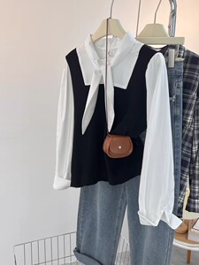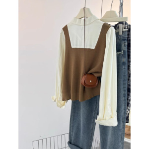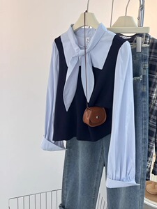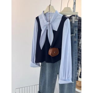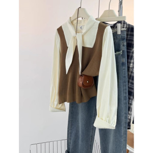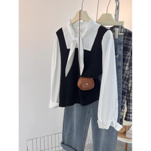 假两件针织马甲拼接长袖衬衫女秋季时尚减龄洋气百搭宽松系带上衣