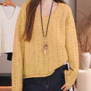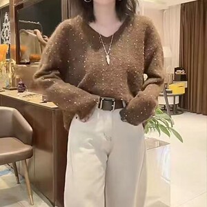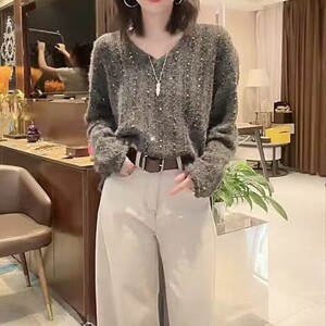 春秋新款时尚韩系V领彩色毛球亮片套头毛衣女宽松显瘦慵懒针织衫