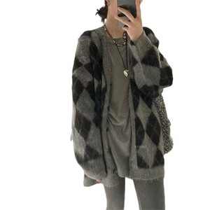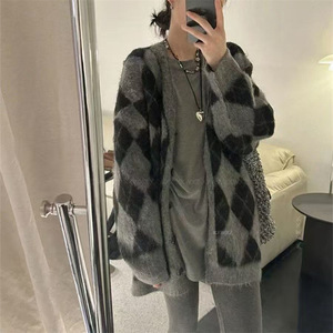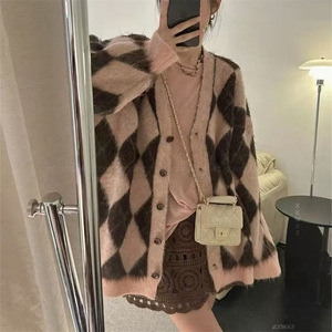 韩系撞色菱格软糯毛衣开衫外套女秋冬慵懒风宽松大码针织衫上衣女