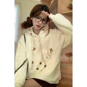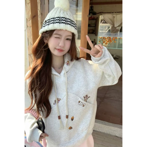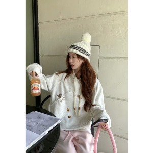 韩版卡通刺绣连帽卫衣女春秋冬加绒加厚宽松慵懒风高级感灰色外套