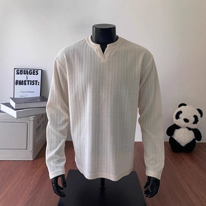 美式深灰色v领卫衣男秋季麦穗条纹提花长袖t恤cleanfit正肩打底衫