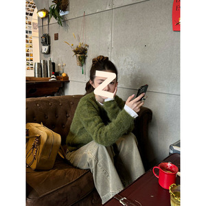 复古橄榄绿套头加厚针织开衫上衣2025年秋冬季气质保暖减龄毛衣女
