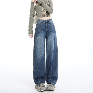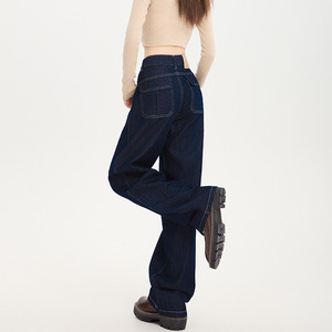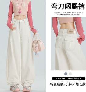 2025秋新款深色特色后袋高腰弯刀阔腿牛仔裤女显瘦直筒宽松拖地裤