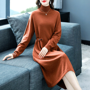 2025秋冬新款宽松收腰连衣裙内搭女长款过膝针织纯色衫百搭毛衣裙