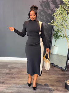 亚马逊欧美跨境女装2025秋季新款长袖拼接撞色收腰显瘦气质连衣裙