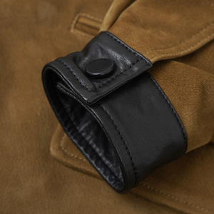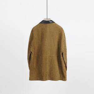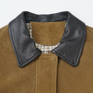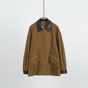 复古巴恩风 JIN口山羊皮正绒鹿绒皮宽松拼色翻领中长款夹克外套女