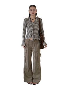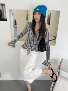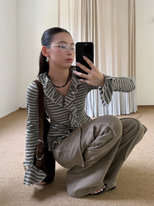MMFISH时髦街头撞色休闲荷叶边条纹V领修身显瘦长袖T恤25T522