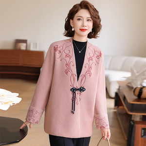 妈妈秋装仿水貂开衫外套中老年女春秋洋气针织毛衣国风中长款上衣