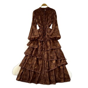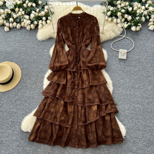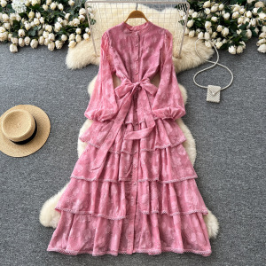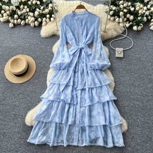 法式高端气质蕾丝拼接绑带收腰荷叶边连衣裙女秋季显瘦优雅长裙子