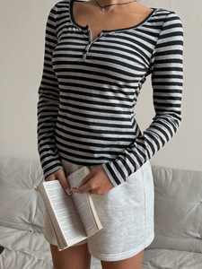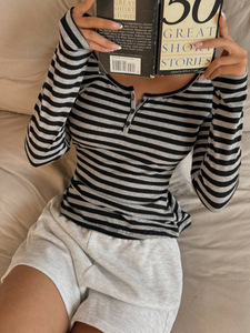 条纹撞色纽扣设计感正肩长袖T恤女2025早秋新款修身显瘦百搭上衣