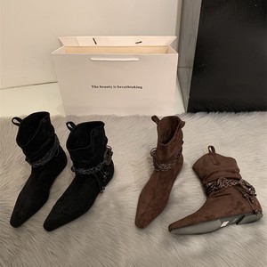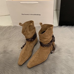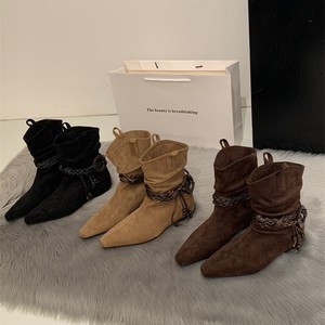 欧洲站内增高绒面短靴女2025秋冬尖头丝巾瘦瘦靴设计感西部靴子潮