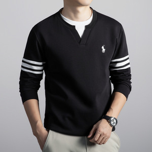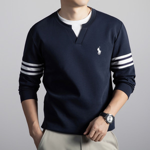 跨境圆领假两件撞色拼接经典小马标卫衣男三条杠条纹休闲上衣男