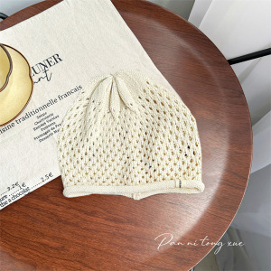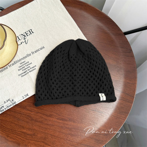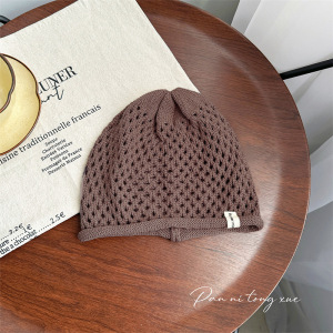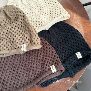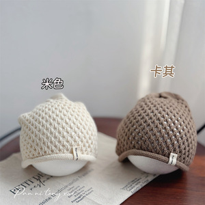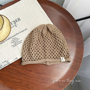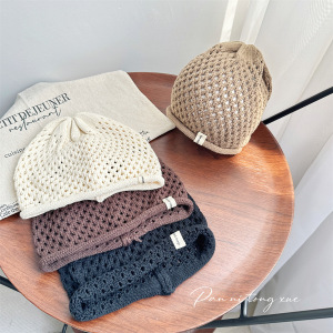 韩系儿童毛线帽手工镂空带标堆堆帽冷帽新款透气百搭纯色针织帽子