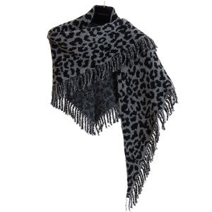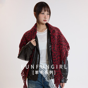 复古豹纹流苏围巾秋冬高级感百搭含羊毛三角巾保暖时尚针织女披肩
