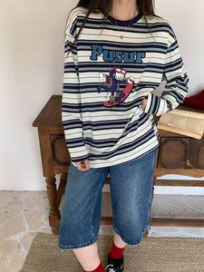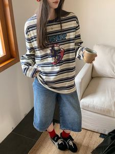 美式秋季街头潮撞色圆领卡通字母印花条纹T恤宽松显瘦长袖上衣ZG
