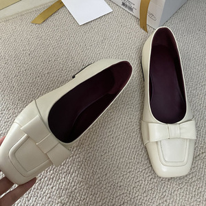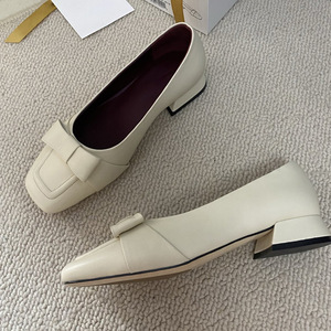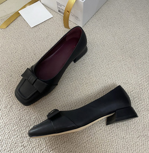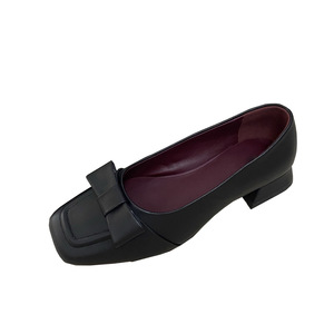 2025秋季新款真皮方头粗跟单鞋蝴蝶结浅口皮鞋中跟高跟鞋通勤女鞋