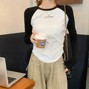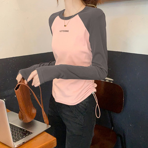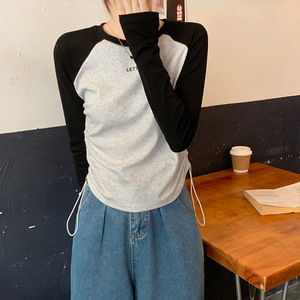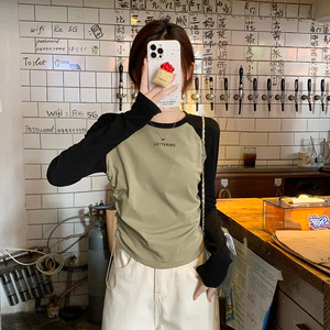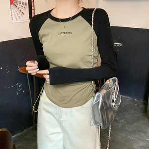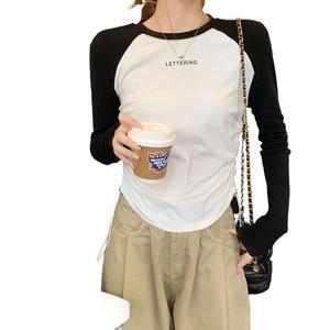 绿色长袖弧形下摆上衣女早秋收腰抽绳chic美式辣妹撞色T恤打底衫