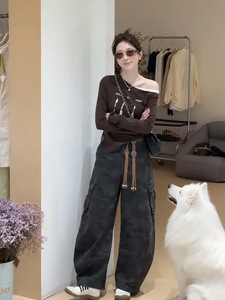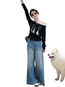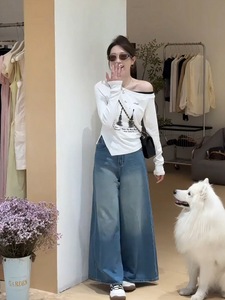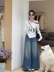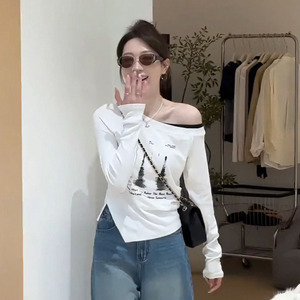 大码胖mm早秋新款时尚百搭斜肩印花假两件上衣修身显瘦长袖T恤女