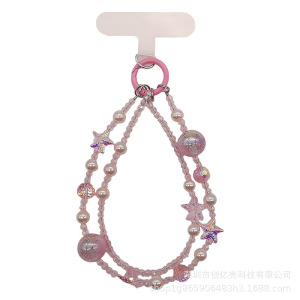 新款粉色水晶海星珍珠手机链女式手工串珠短款手腕链钥匙扣防丢链