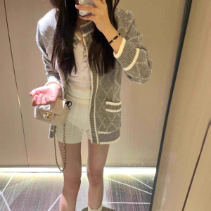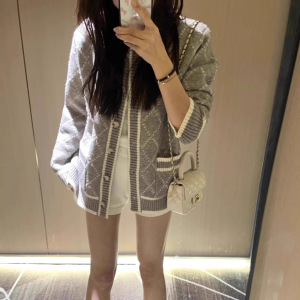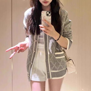 设计感菱格长袖针织开衫女2025秋冬新款灰色休闲百搭毛衣外套上衣