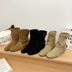 小众绒面复古皮带扣堆堆靴女2025新款法式粗跟百搭显瘦中筒马丁靴