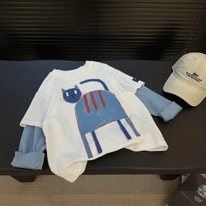 男童假两件撞色T恤2025秋季卡通猫咪长袖T恤中小童宽松t恤跨境