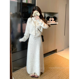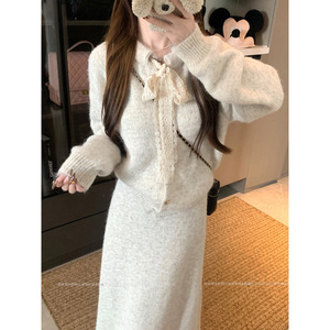 肥柒柒大码胖mm温柔设计感系丝带气质显瘦开衫半身裙毛衣套装