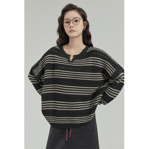 「HUIXI」条纹镂空针织衫女秋季2025新款复古气质小众设计感上衣