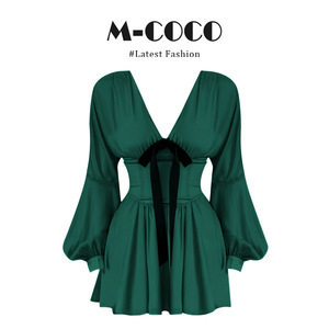 纯欲风立体蝴蝶结v领长袖连衣裙女早秋新款慵懒风短裙