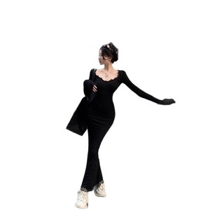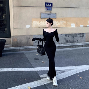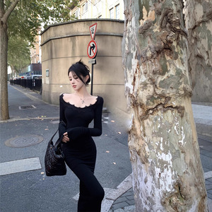 实拍秋季新款蕾丝花边拼接设计感修身显瘦气质长袖长款收腰连衣裙