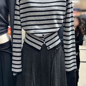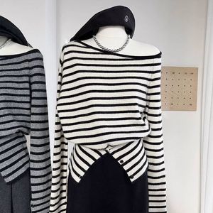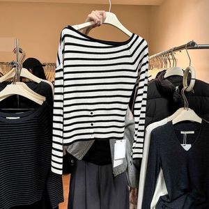 2025春秋新款韩系套头小众条纹撞色排扣开叉不规则针织衫上衣女