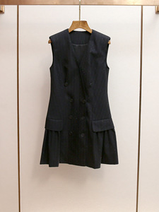S家秋季新款法式通勤职场风烫钻条纹双排扣西装背心直筒连衣裙女