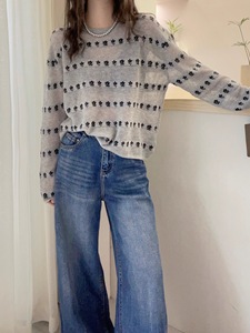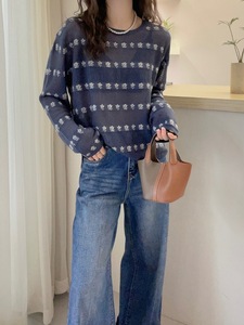 欧洲站2025秋季圆领慵懒落肩袖复古菱格拼色薄款针织衫