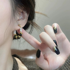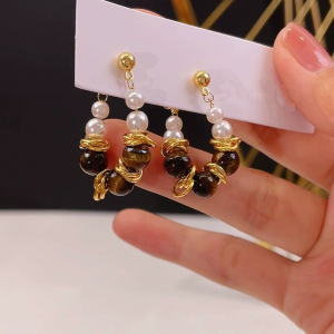 天然虎眼石珍珠拼接链条耳钉女复古美拉德轻奢时尚秋冬耳环耳饰