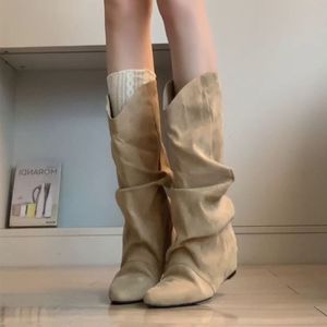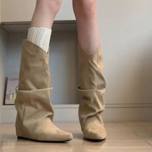 羊皮版~内增高尖头褶皱堆堆靴不过膝长靴女显瘦复古西部靴中筒靴