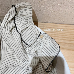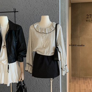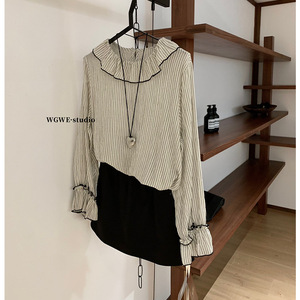 WGWE7158条纹荷叶领喇叭袖衬衫法式复古显瘦气质长袖上衣