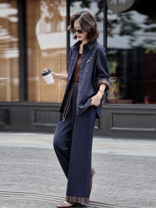 早秋套装女2025春秋新款宽松洋气牛仔衬衫阔腿裤两件套休闲一整套