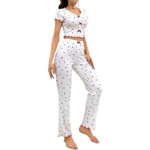 欧美跨境热销家居服印花爱心V领短袖睡衣女可外穿长裤两件 套套装